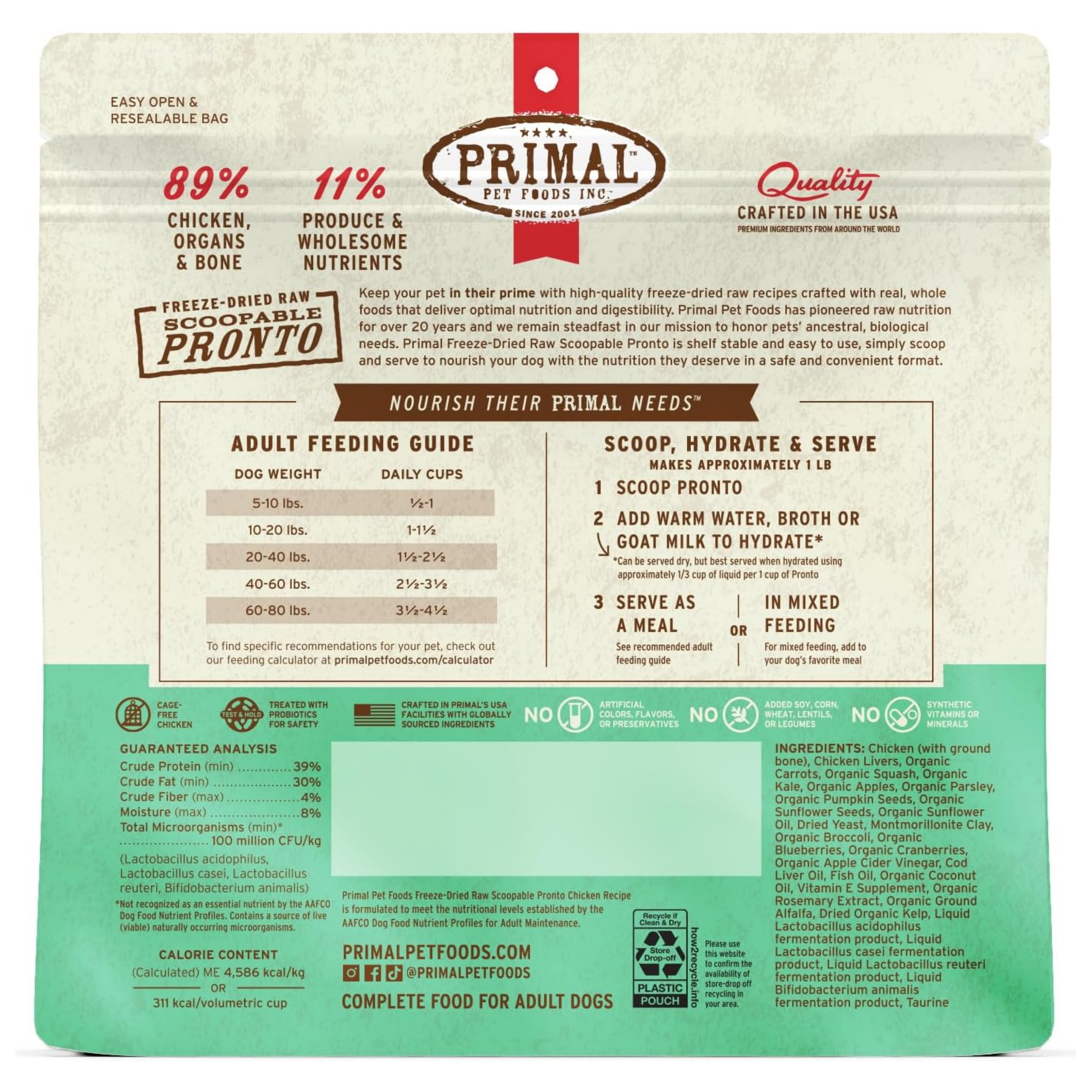 Primal Freeze-Dried Raw Chicken Pronto Mini Nuggets are crafted with cage-free chicken raised without antibiotics, steroids, or added hormones, paired with USDA certified organic fruits and vegetables. This grain-free, minimally processed recipe provides complete and balanced raw nutrition that is easy to scoop, serve, and highly digestible for your dog’s overall health.